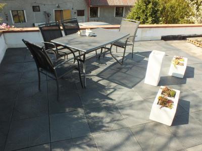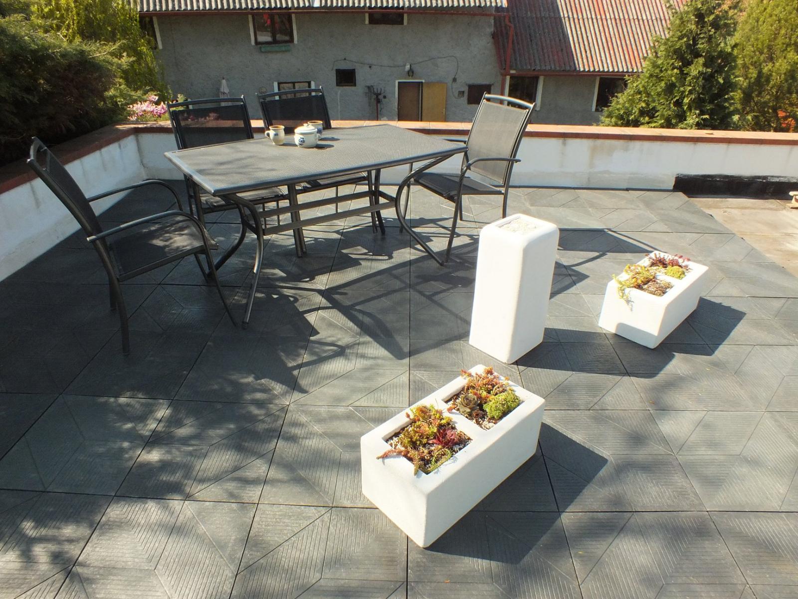 Terasy, pultové střechy nebo plochy s esteticky nevyhovujícím betonem, asfaltem či starou dlažbou jsou ideální místa pro naši plastovou terasovou dlažbu z materiálu TRAPLASTU ™. Oproti konvenční dlažbě oceníte velmi nízkou hmotnost - pouze 5,12 kg a 8,2 kg u většího formátu dlaždice! Dlaždice se pokládají na podložky s pevnou výškou, které musí ležet na rovné a nedrolivými hydroizolační vrstvě. Pokládka je doslova jen pokládka, nic se nelepí, nevrtá ani nešroubuje kromě krajní rady, která musí být zajištěna proti pohybu. Pod dlažbou můžete vést třeba vodoinstalaci k bazénu a spárami mezi dlaždicemi rychle proteče i velký příval srážkové vody.
