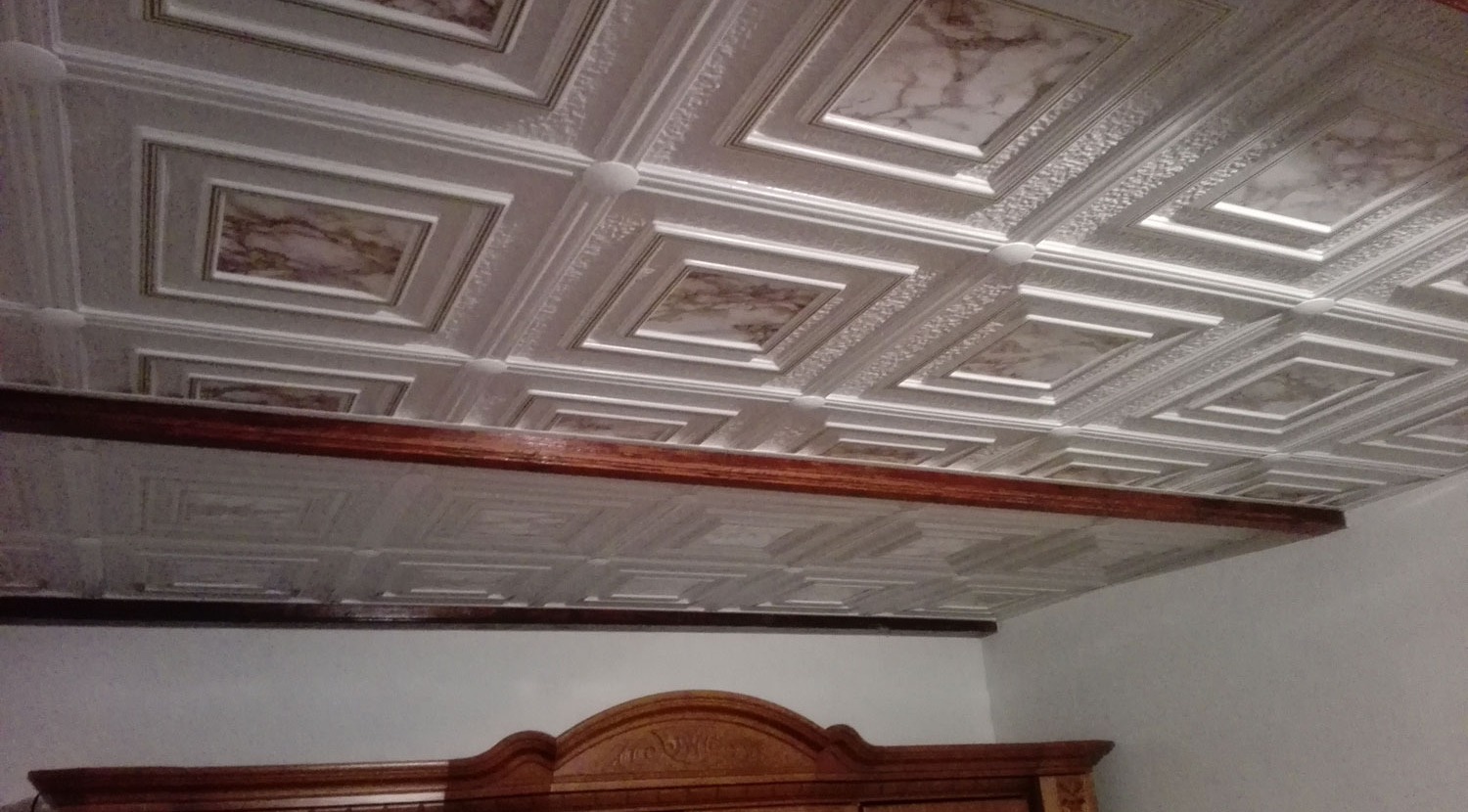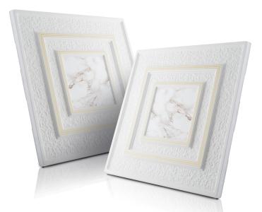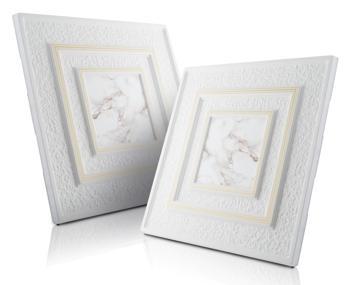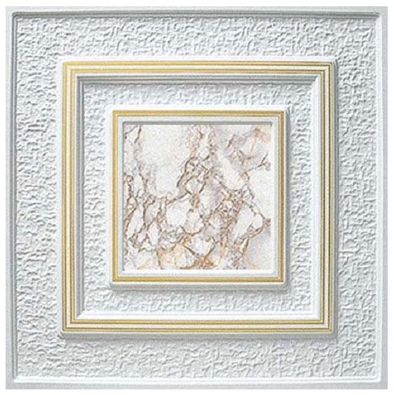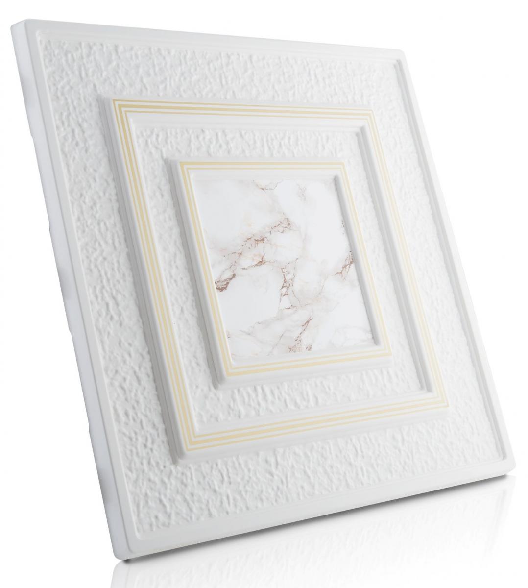 Velice žádaný vzor stropního podhledu pro náročnějšího zákazníka. Tento vzor se zejména hodí pro malé pokoje i velké místnosti a vytváří nezaměnitelný exklusivní zámecký styl. Jemná a přesná zlatá linka dodává obkladu ten správný efekt v kombinaci s hnědobílým mramorem, že nebudete chtít oči odtrhnout. Oblíbený vzor.