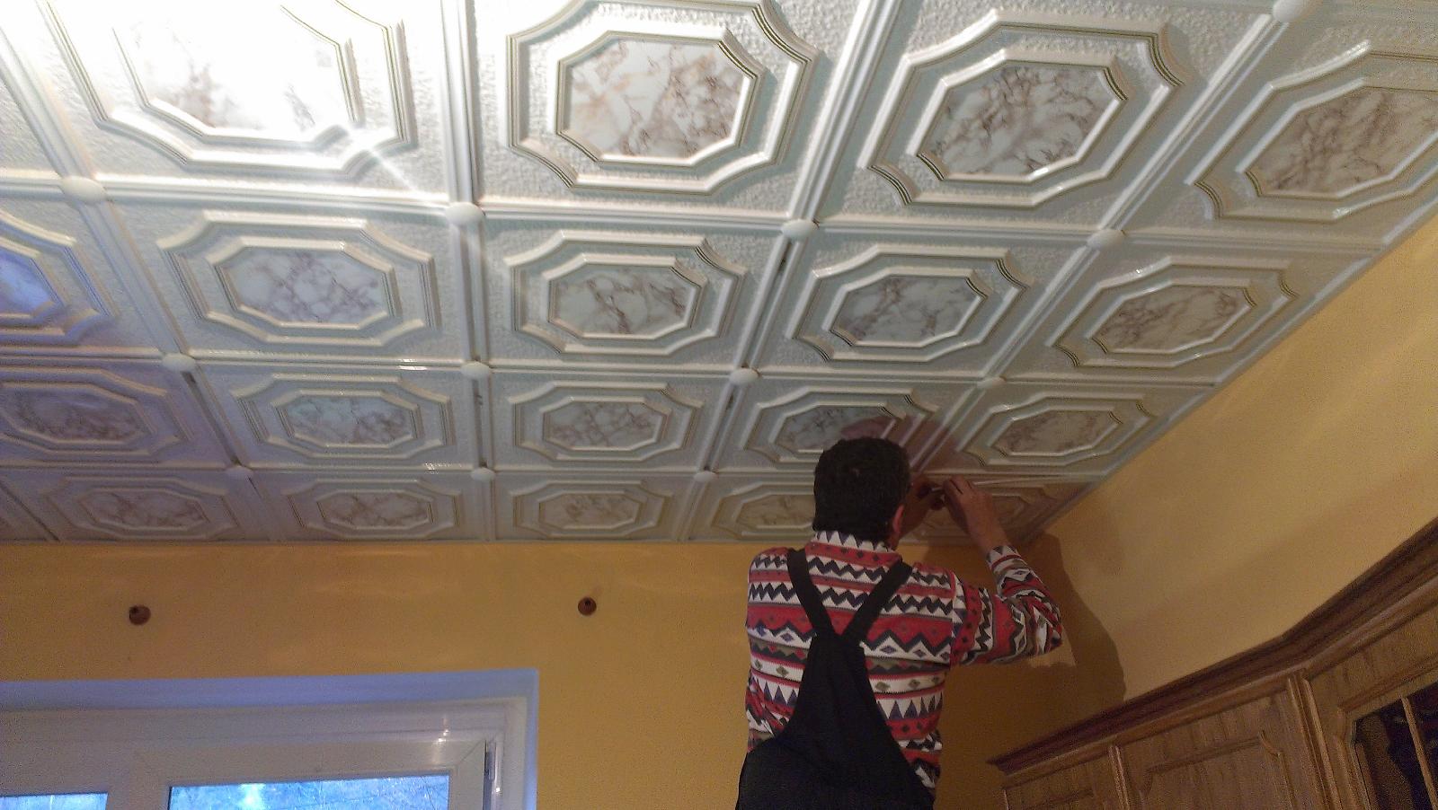 Jednotlivé stropní kazety a krycí lišty se jednoduše do lišty při kraji zasouvají. Vyrobeno z plastu bílé barvy.