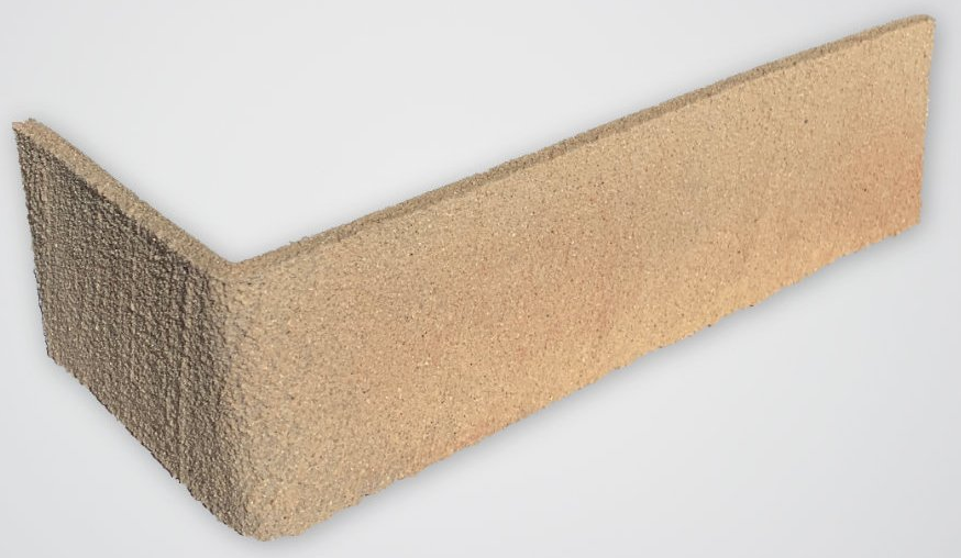 Rohový obklad pro obložení vnějších rohů. Rohové obklady jsou již předohnuté do pravého úhlu, nehrozí tak jejich prasknutí. Rohové obklady prodáváme po celých baleních - v jednom balení jsou 2 bm rohů - měří se na výšku rohu. V jednom balení je 24 ks rohových pásků. Obložit rohy lze dvěma způsoby. První řešení je kompromisní mezi cenou a kvalitou provedení. Každý cihlový pásek umíte ohnout za pomoci horkovzdušné pistole do 90 stupňového úhlu, může se však stát, že se to nepodaří naprosto hezky a bude vidět v místě ohybu mikropraskliny. Ten druhý jednodušší způsob je použít originální rohové prvky, které jsou dostupné pro každý vzor obkladu. V obou případech lze s obkladem dosáhnout designu uzavřeného rohu. Přímo na rohu není žádný spoj, vytváří to 3D efekt pravého cihlového obkladu.